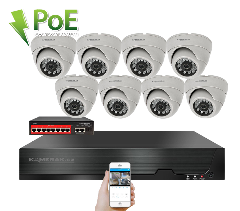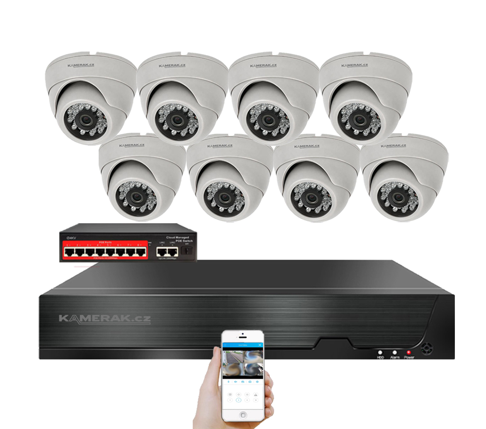 IP kamerový set s externím PoE pro jednoduché sestavení svépomocí. NVR v sobě nemá instalováno napájení kamer, které je řešeno pomocí switch. Lze tedy umístit switch (napájení IP kamer) na jiné místo než rekordér, který se následně připojuje k obrazovce/internetu.