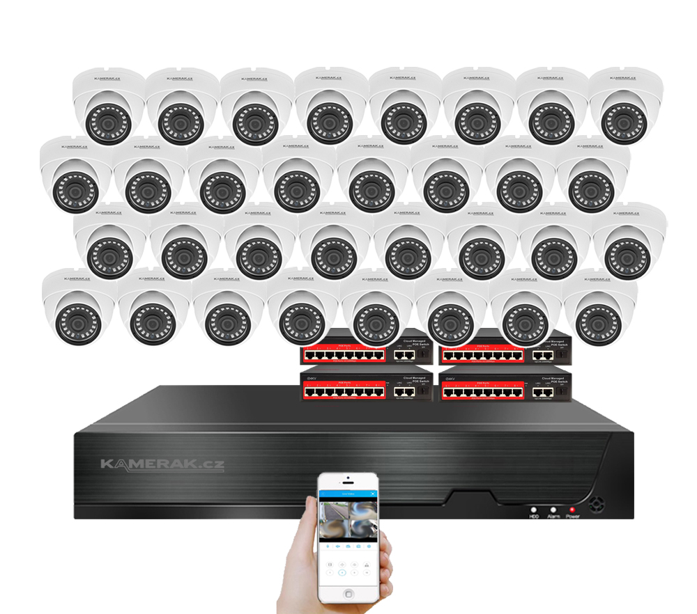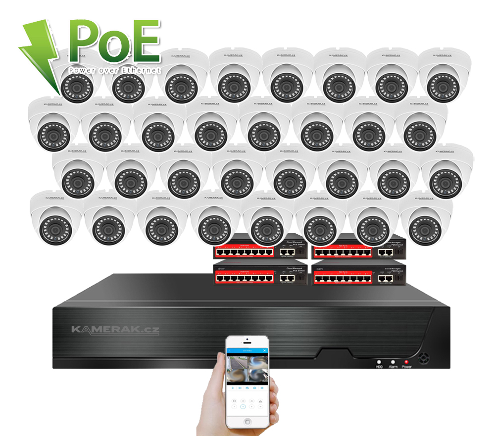 IP kamerový set s externím PoE pro jednoduché sestavení svépomocí. NVR v sobě nemá instalováno napájení kamer, které je řešeno pomocí switch. Lze tedy umístit switch (napájení IP kamer) na jiné místo než rekordér, který se následně připojuje k obrazovce/internetu.