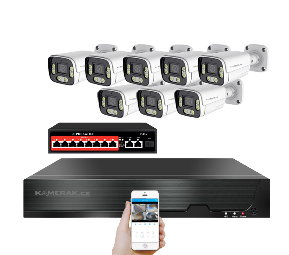 IP kamerový set s externím PoE pro jednoduché sestavení svépomocí. NVR v sobě nemá instalováno napájení kamer, které je řešeno pomocí switch. Lze tedy umístit switch (napájení IP kamer) na jiné místo než rekordér, který se následně připojuje k obrazovce/internetu.