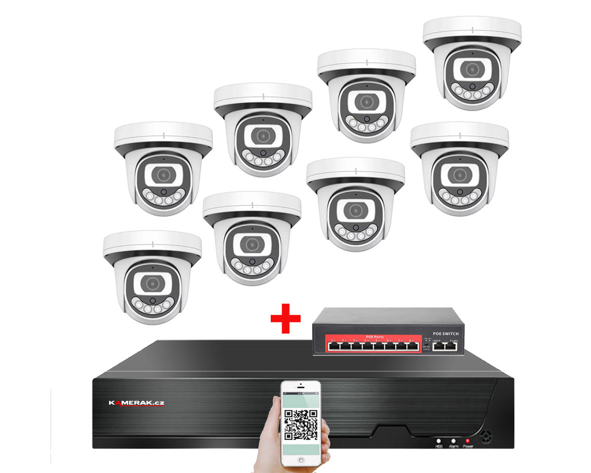 IP kamerový set s externím PoE pro jednoduché sestavení svépomocí. NVR v sobě nemá instalováno napájení kamer, které je řešeno pomocí switch. Lze tedy umístit switch (napájení IP kamer) na jiné místo než rekordér, který se následně připojuje k obrazovce/internetu.