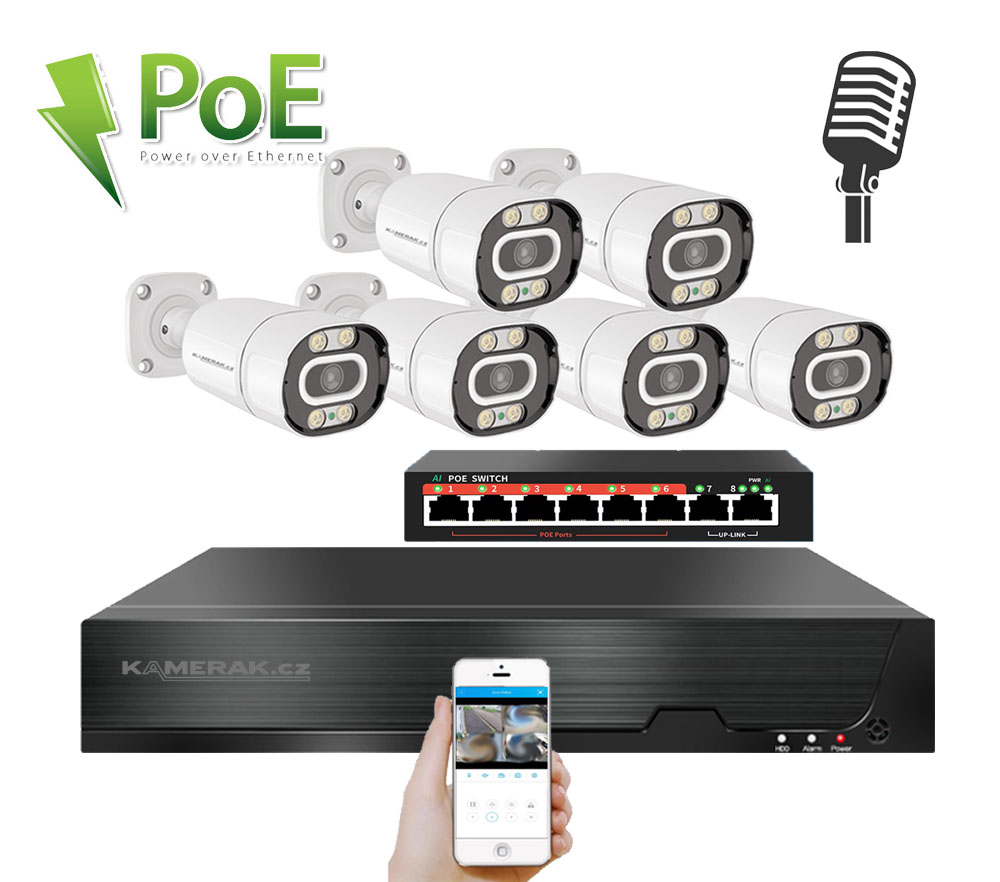 IP kamerový set s externím PoE pro jednoduché sestavení svépomocí. NVR v sobě nemá instalováno napájení kamer, které je řešeno pomocí switch. Lze tedy umístit switch (napájení IP kamer) na jiné místo než rekordér, který se následně připojuje k obrazovce/internetu.