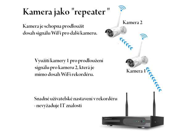 Statická WiFi kamera zaručuje vizuální přehled o dění ve snímaném prostoru. Kamera disponuje funkcí repeateru (opakovače), kdy je schopna prodloužit signál pro další kameru, která je umístěna mimo dosah WiFi rekordéru.