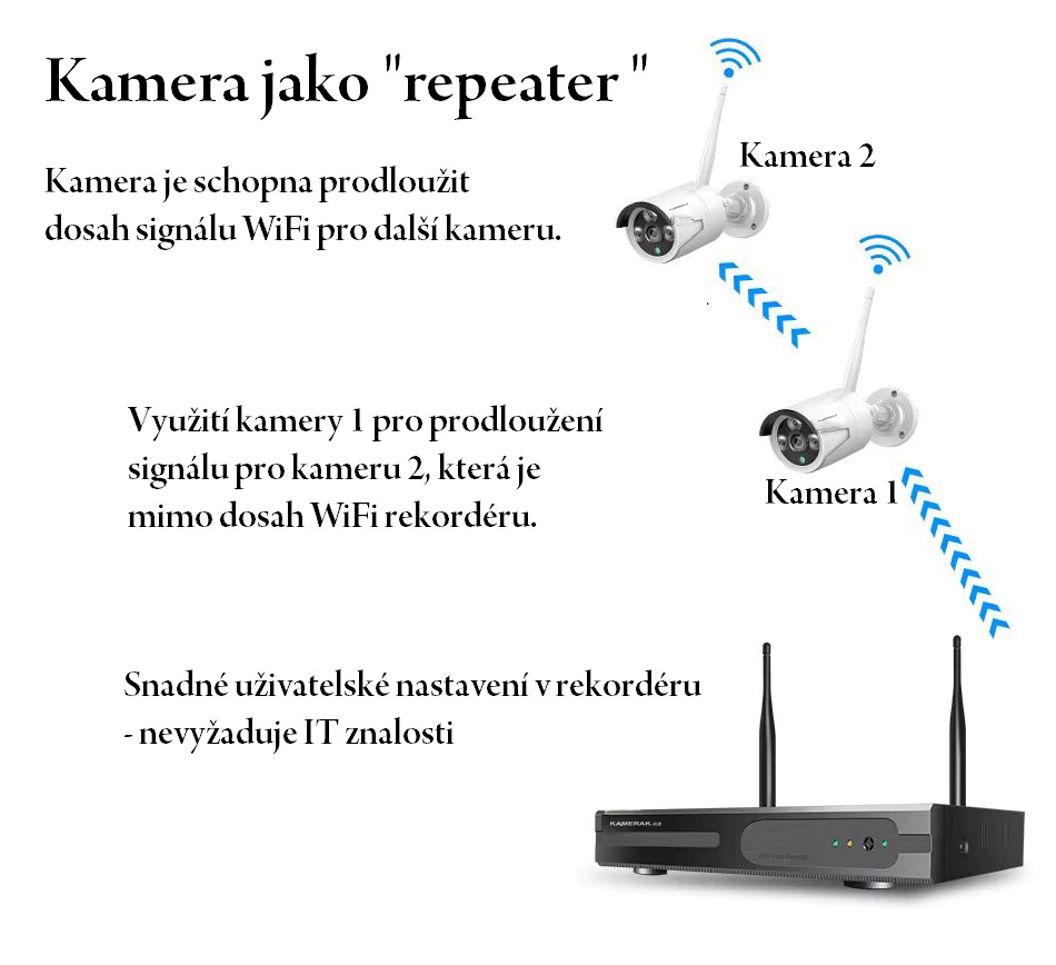 Otočná WiFi kamera zaručuje vizuální přehled o dění ve snímaném prostoru. Kamera disponuje funkcí repeateru (opakovače), kdy je schopna prodloužit signál pro další kameru, která je umístěna mimo dosah WiFi rekordéru.