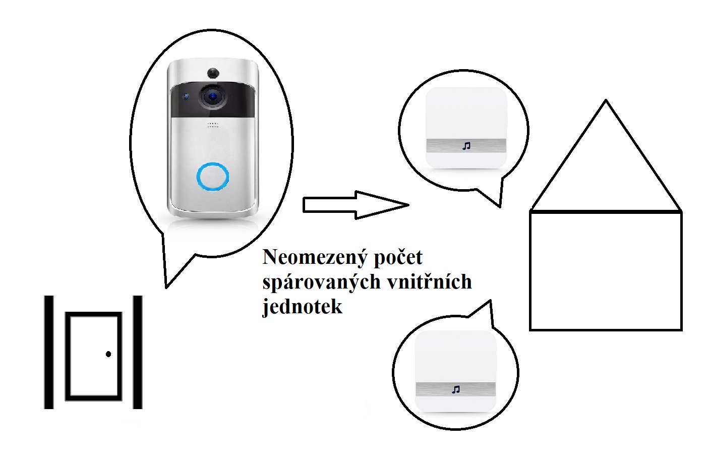 Díky funkci připojení více vnitřních jednotek lze z jednoho video zvonku vysílat signál a tím spustit zvonění na více vnitřních jednotkách a umožnít tak upozornění na zvonění u dveří ve více místnostech.