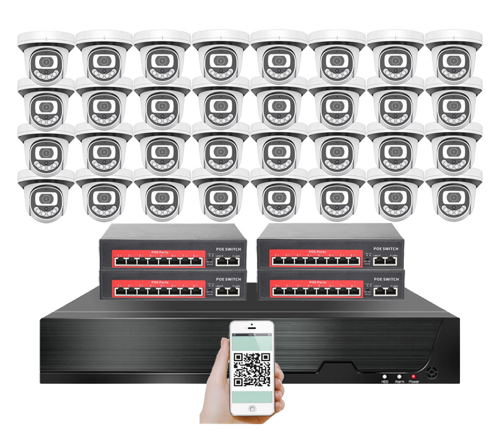 IP kamerový set s externím PoE pro jednoduché sestavení svépomocí. NVR v sobě nemá instalováno napájení kamer, které je řešeno pomocí switch. Lze tedy umístit switch (napájení IP kamer) na jiné místo než rekordér, který se následně připojuje k obrazovce/internetu.