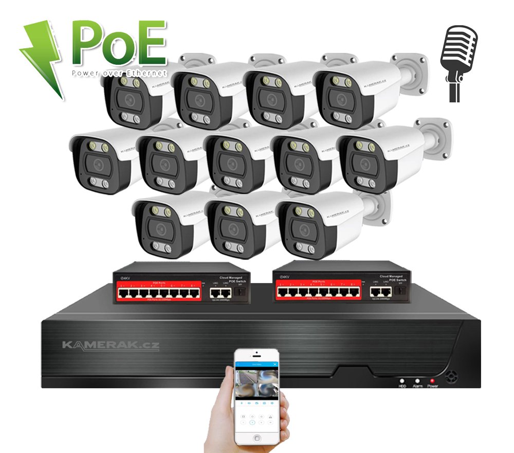 IP 12 kamerový set s externím PoE a českým menu, snadná instalace, vzdálený přístup přes telefon nebo PC, ideální pro zabezpečení.