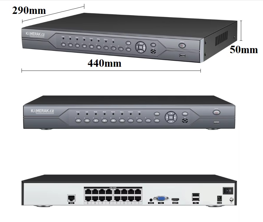 Záznam probíhá v plném rozlišení a 8 MPx (2592 x 1944 pixelů) obrazových bodů v rychlosti a 30 snímků za sekundu. Rekordér lze osadit 2ks SATA II/II pevným diskem a do kapacity 8TB. Připojení zařízení k televizi či monitoru se realizuje pomocí HDMI, VGA či analogového rozhraní. Nastavení lze provádět z českého OSD Menu na obrazovce připojené televize pomocí myši, kterou naleznete v příslušenství.