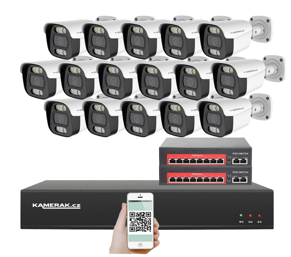 IP kamerový set s externím PoE pro jednoduché sestavení svépomocí. NVR v sobě nemá instalováno napájení kamer, které je řešeno pomocí switch. Lze tedy umístit switch (napájení IP kamer) na jiné místo než rekordér, který se následně připojuje k obrazovce/internetu.