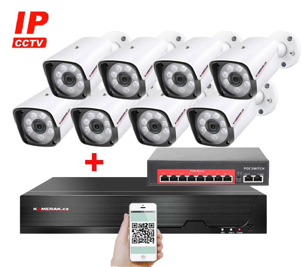 IP kamerový set s externím PoE pro jednoduché sestavení svépomocí. NVR v sobě nemá instalováno napájení kamer, které je řešeno pomocí switch. Lze tedy umístit switch (napájení IP kamer) na jiné místo než rekordér, který se následně připojuje k obrazovce/internetu.