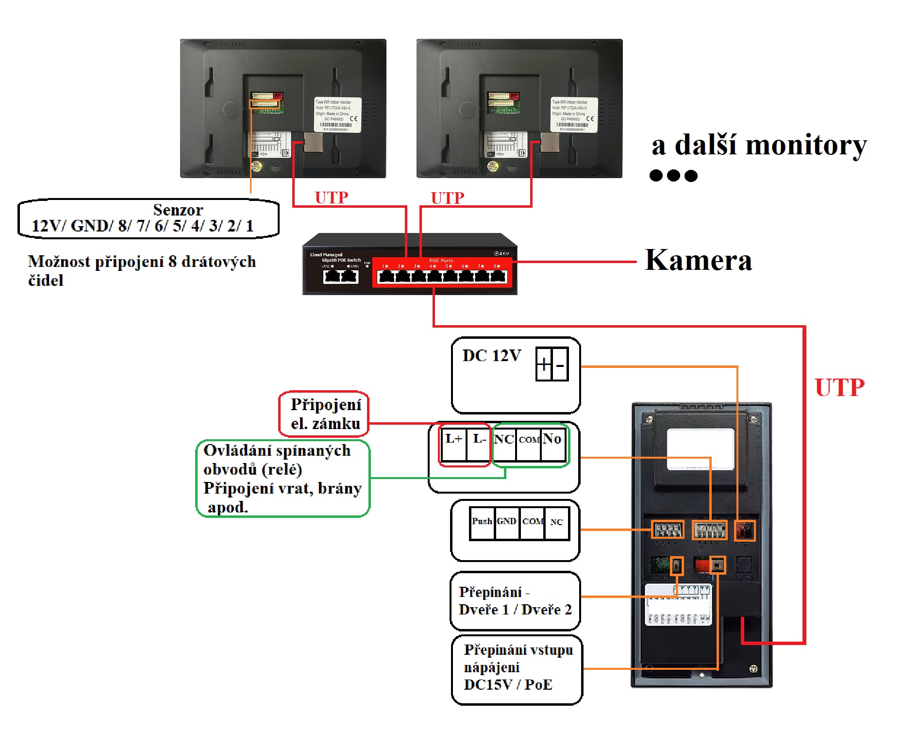 V případě využítí více zařízení se využívá PoE Switch (níže v doporučeném zboží), kdy PoE switch zapojíte do zásuvky 230V a následně všechny komponenty (další monitor, další video zvonek či kamery) připojíte do PoE switche (data i napájení jedním UTP kabelem). Pro vzdálenou správu pomocí mobilní aplikace připojíte monitor (vnitřní jednotky) pomocí WiFi nebo připojte PoE switch kabelově k routeru. (ve fotogalerii schéma zapojení)