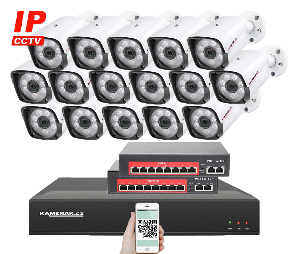 IP kamerový set s externím PoE pro jednoduché sestavení svépomocí. NVR v sobě nemá instalováno napájení kamer, které je řešeno pomocí switch. Lze tedy umístit switch (napájení IP kamer) na jiné místo ne rekordér, který se následně připojuje k obrazovce/internetu.