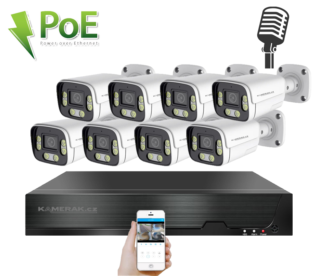 Digitální kamerový set PoE IP XM-806D 8MPx značky KAMERAK.cz nabízí vizuální zabezpečení Vašeho domu, chaty, skladu obchodu a dalších prostor. Velmi jednoduchá instalace , kdy stačí pouze propojit samotné kamery s NVR pomocí UTP kabelu a následně podle českého návodu v rekordéru načíst IP adresy kamer. Napájení kamer se provádí, společně s daty, pomocí UTP kabelu přímo z NVR, tudíž není třeba řešit problematiku externího napájení. Díky jednoduchému a intuitivnímu zapojení zvládnete instalaci dohledového systému svépomocí. Součástí kamerového setu jsou všechny potřebné komponenty pro zprovoznění (pro záznam je nutný pouze HDD, který není součástí balení). Při nákupu HDD společně s kamerovým setem Vám jej zdarma odborně nainstalujeme. Lze připojit záznamové zařízení pomocí síťového kabelu do Vašeho routeru a tím získáte vzdálený přístup a sledování obrazu kamer na Vašem telefonu (Android, iOS), tabletu nebo PC. Menu NVR je v českém jazyce a součástí balení je i český návod, díky tomu je ovládání kamerového systému velmi jednoduché.