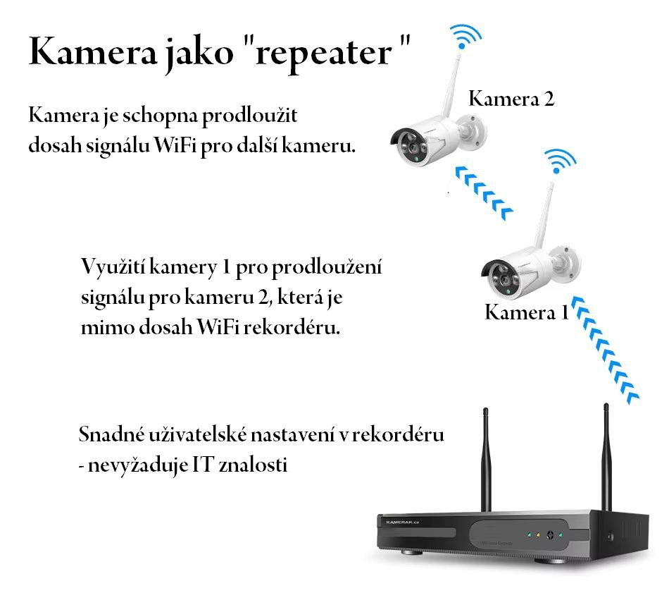 Statická WiFi kamera zaručuje vizuální přehled o dění ve snímaném prostoru. Kamera disponuje funkcí repeateru (opakovače), kdy je schopna prodloužit signál pro další kameru, která je umístěna mimo dosah WiFi rekordéru.