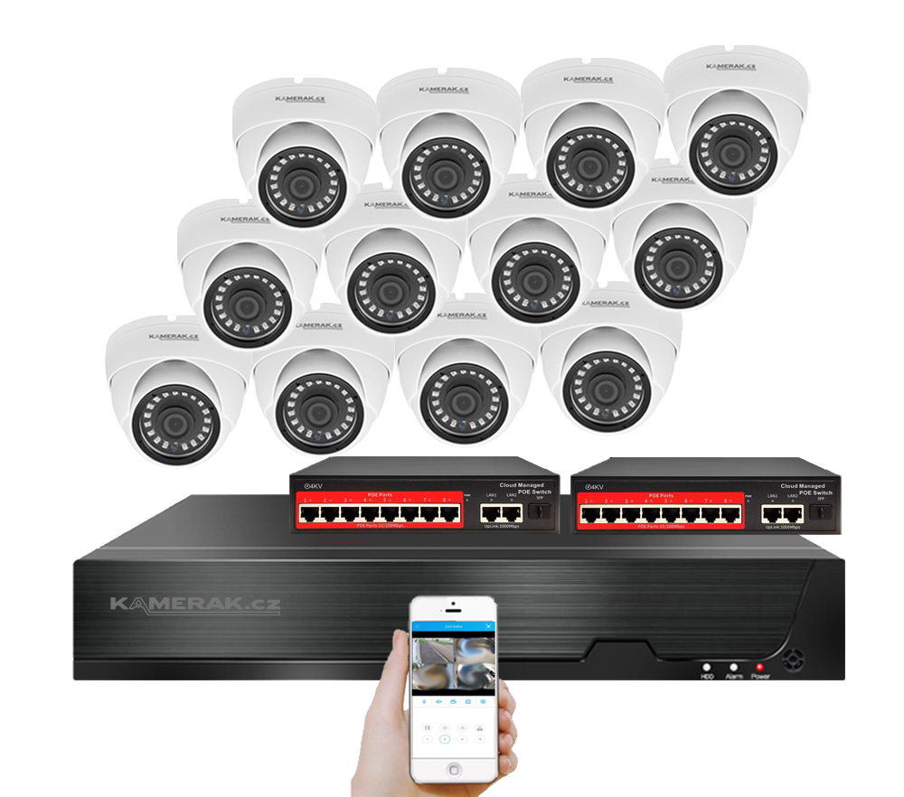 IP kamerový set s externím PoE pro jednoduché sestavení svépomocí. NVR v sobě nemá instalováno napájení kamer, které je řešeno pomocí switch. Lze tedy umístit switch (napájení IP kamer) na jiné místo než rekordér, který se následně připojuje k obrazovce/internetu.